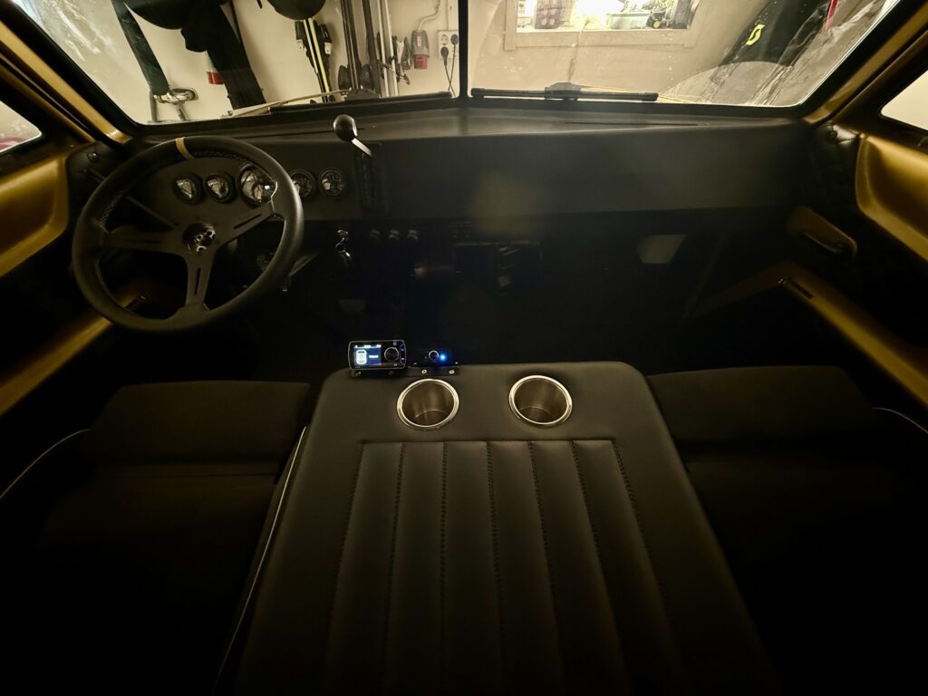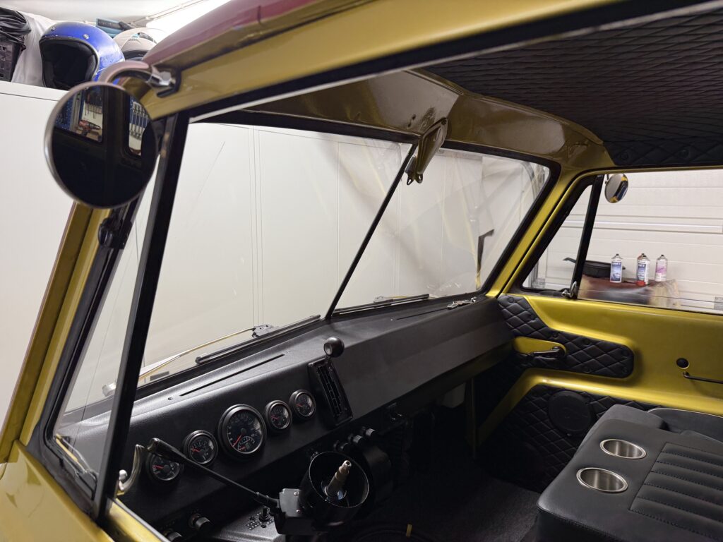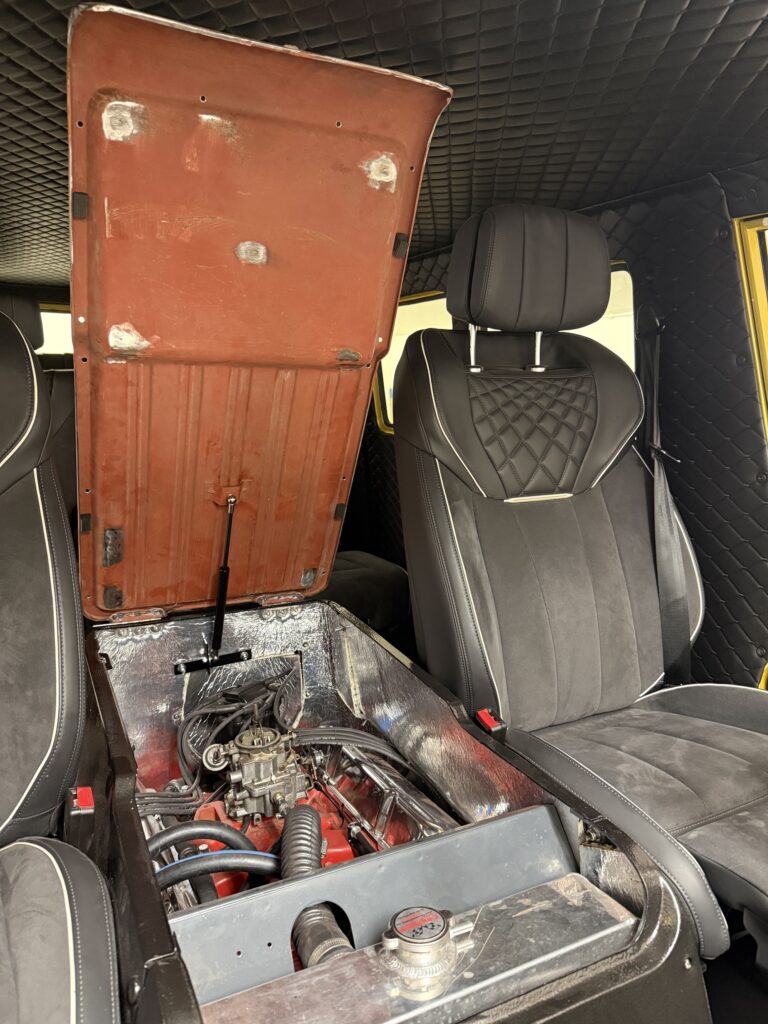 I also got inspiration from the Dodge A100 forum on Facebook where someone had made an overlay on the hood with a cup holder. I made the foundation and then I have to thank my father who helped me sew and cover it with leather. I was really happy with the end result.