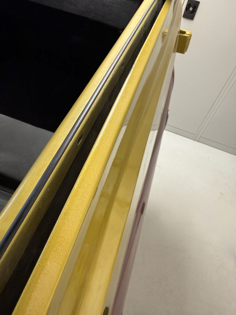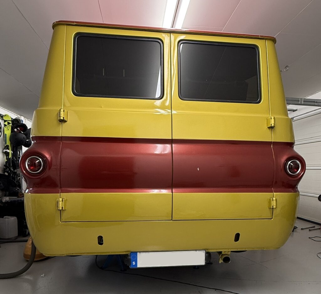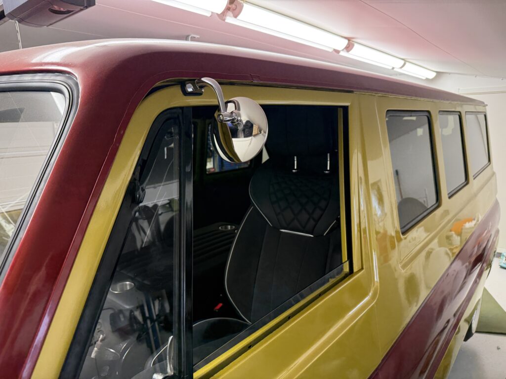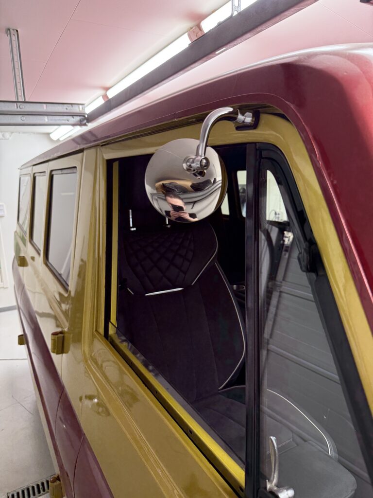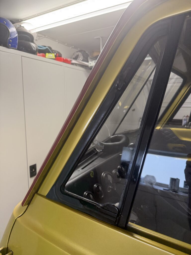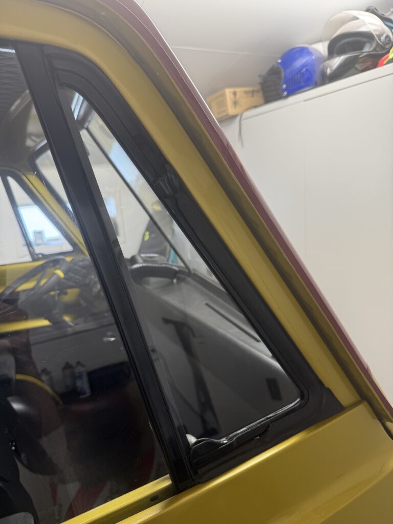 I made a template for the small side windows for the front doors and had them made. Now they are also installed. I’m just missing the scraper strips for the larger door windows. I’ve been looking but haven’t managed to find and buy any new scraper strips yet.