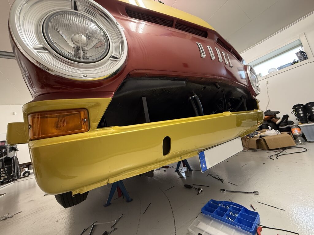 I’m guessing the car was towed by one of the previous owners. The tow rope was probably not only around the front axle but also around the steering rod. Removed, straightened and reassembled. Looks a little better.