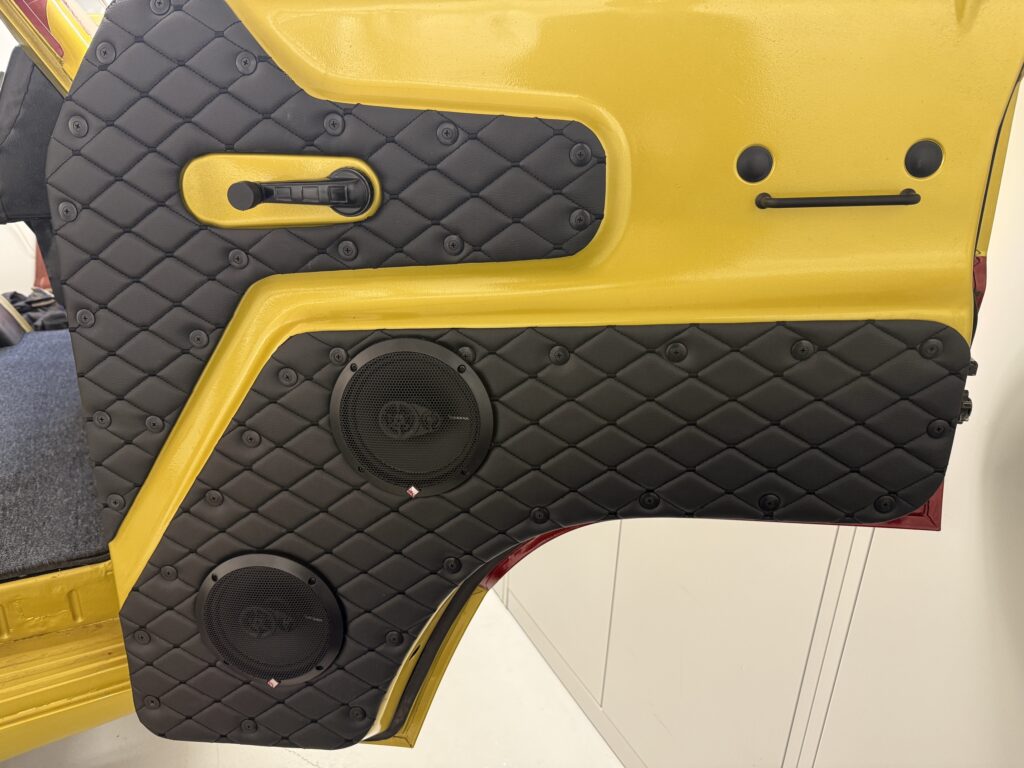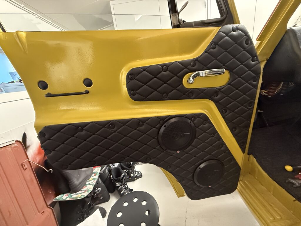 Made templates for the upper panels on the front doors. Cut out the aluminum sheets and covered them with some artificial leather. Final assembly and this is the result.