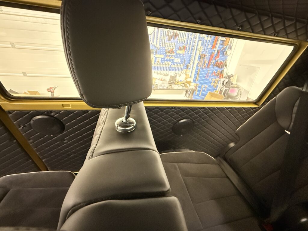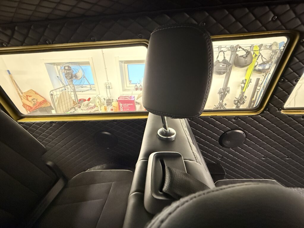 I had to search and search for quite a while before I found suitable chairs that I wanted in the car. I got hold of 2 rear seats 3 + 3 and also 2 front seats from the same car. I was really happy with the result. Now there is room for both family and friends. I had to rebuild the front seats a lot to make them fit. For the rear seats I had to build new frames between the seats and the floor. The seats come from an electric SUV called the Hongqi E-HS9, model year 2023.